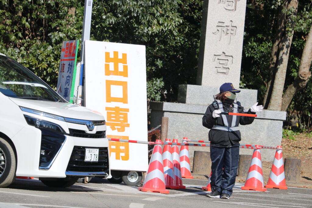東神苑・西神苑の駐車場警備を中心に、周辺道路での交通誘導や参拝動線の確保を行い、毎年の経験を生かした安定した警備により、多くの参拝者が安全に新年を迎えられる環境づくりを支えました。