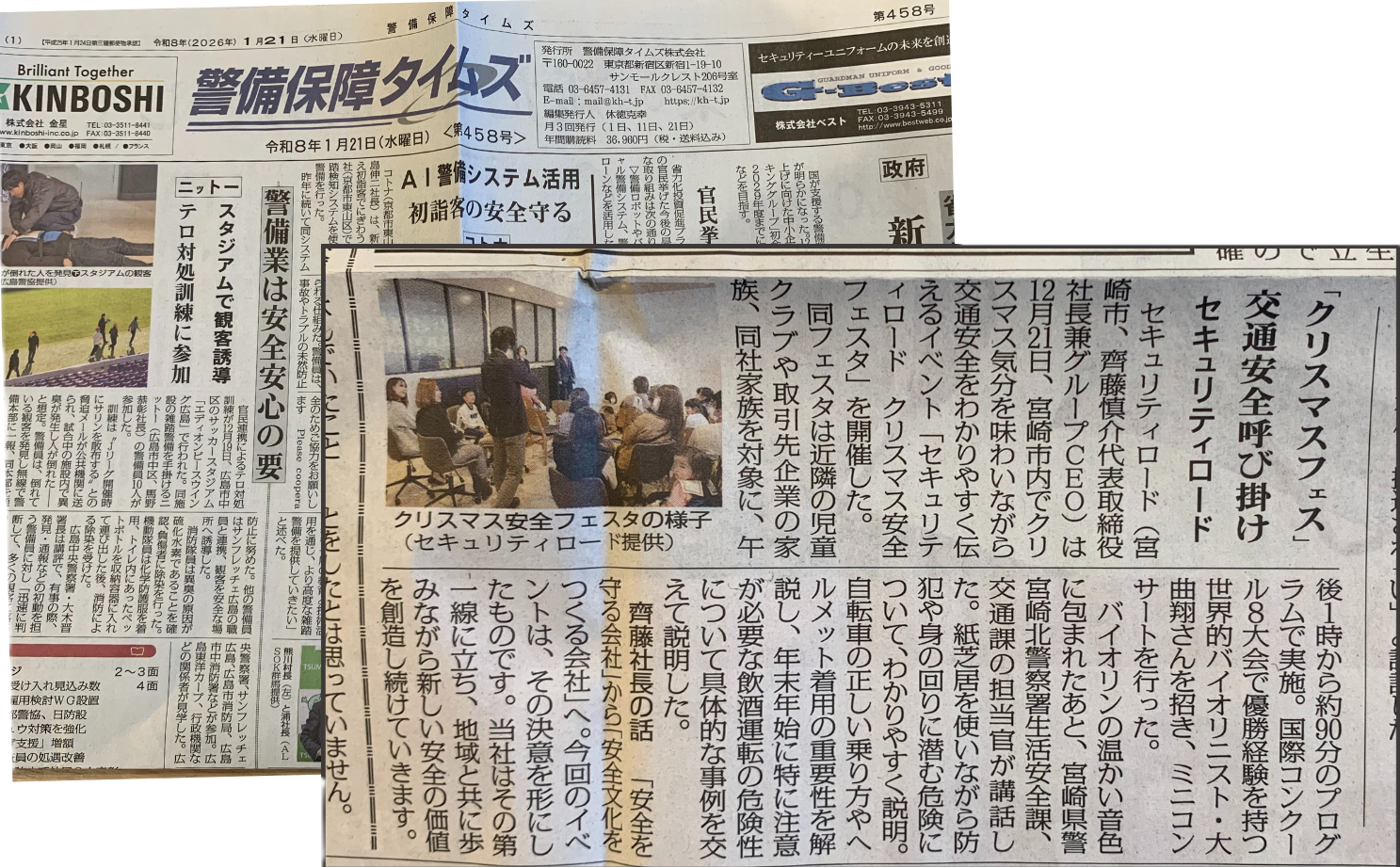株式会社セキュリティロードが2025年12月21日に開催した「セキュリティロード クリスマス安全フェスタ」の取り組みが、業界紙『警備保障タイムズ』に掲載されました。