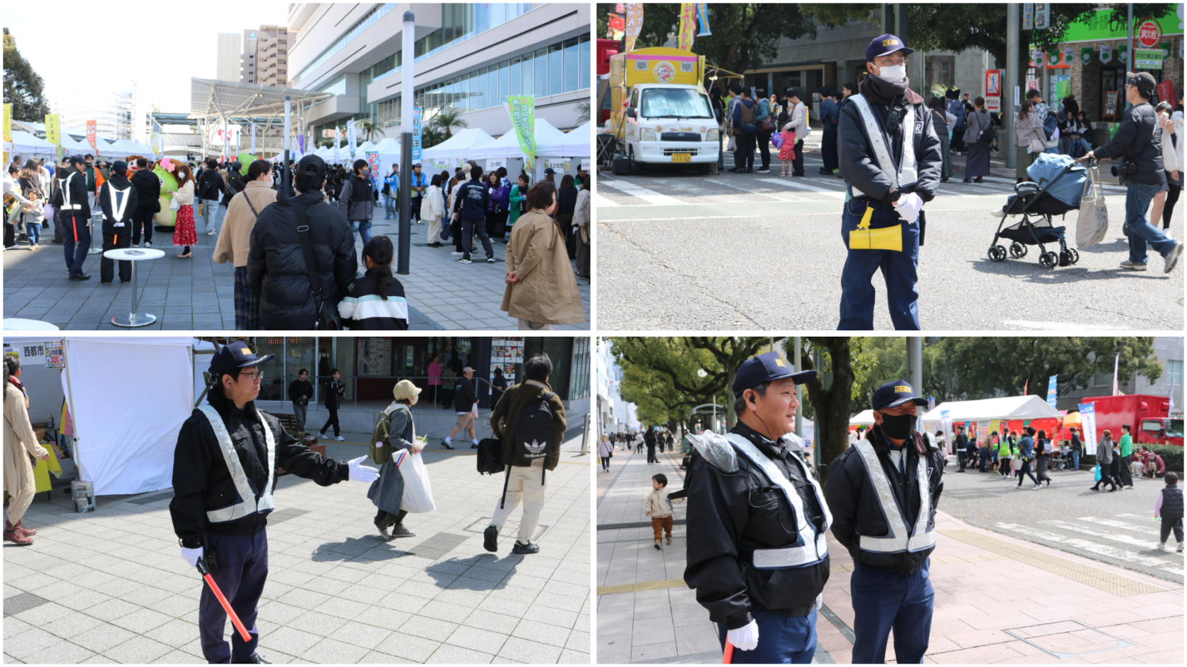 本イベントでは、宮崎営業所の警備員49名体制で会場内の雑踏警備を担当。交通規制が行われた7時から20時まで、多くの来場者が行き交う中で安全確保にあたりました。長時間にわたる警備となるため、隊員同士が連携しながら適切に休憩を取り、集中力を維持した万全の体制で警備を実施しました。