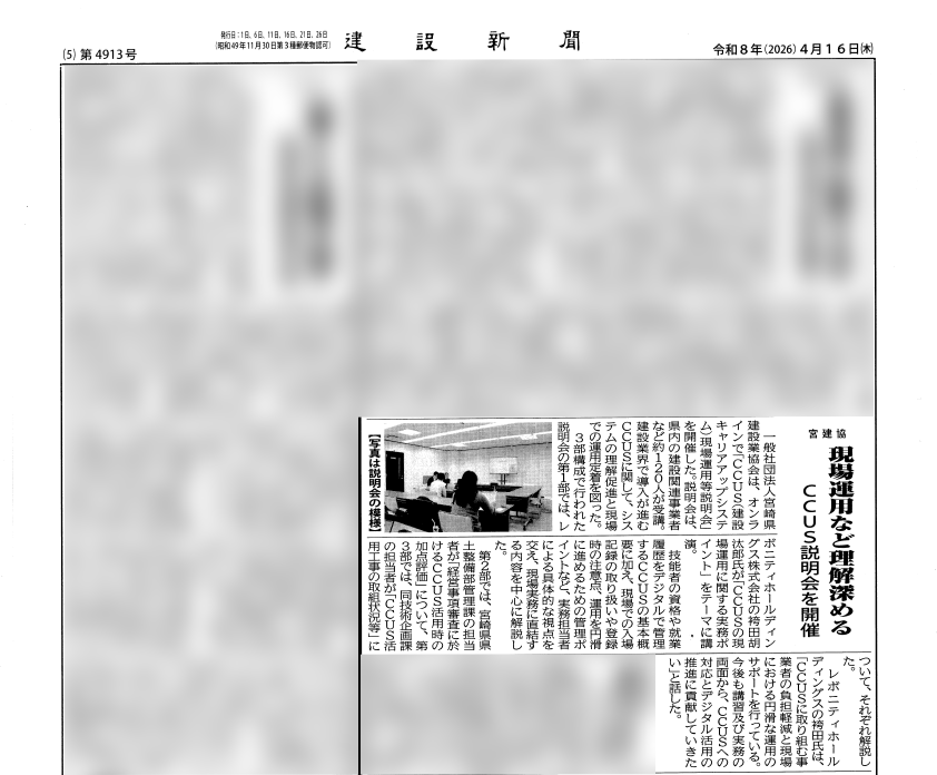今回の記事では、一般社団法人宮崎県建設業協会主催の「CCUS(建設キャリアアップシステム)現場運用等説明会」において、当社の新卒3年目スタッフが講師として登壇した取り組みが紹介されています。